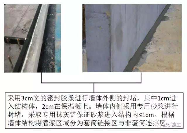 墻體外側(cè)采用彈性防水密封膠條進行封堵,防止注漿料從外側(cè)滲漏,同時可保證上下層墻體之間保溫的連續(xù)性。
